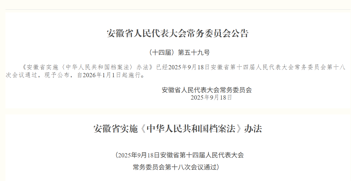 2025年9月18日,安徽省第十四届人大常委会第十八次会议通过《安徽省实施〈中华人民共和国档案法〉办法》(以下简称《办法》),自2026年1月1日起施行,并废止原《安徽省档案条例》。作为《档案法》的地方配套法规,《办法》结合安徽实际,系统规范了档案管理的全流程要求,突出“党管档案”“科技赋能”“区域协同”“文化传承”等核心理念,为全省档案事业发展提供了更精准的制度保障。以下从六大维度解读其核心内容……