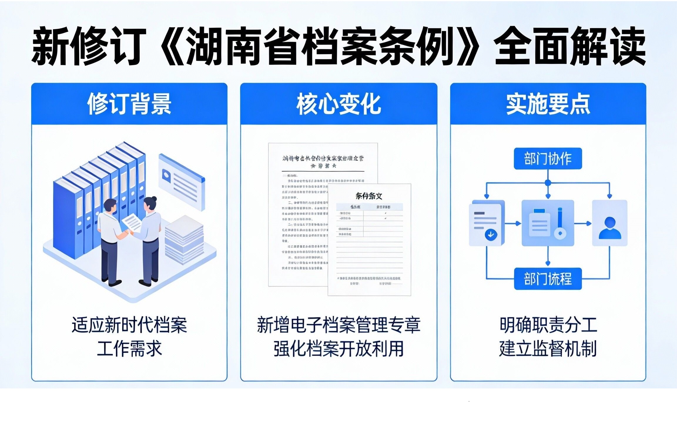 一、修订背景与立法依据新修订的《湖南省档案条例》是自1998年《湖南省档案管理条例》颁布实施27年以来的首次全面修订,将于2026年1月1日起正式施行。此次修订主要基于以下背景和依据:国家法律法规更新:2020年修订的《中华人民共和国档案法》和2024年实施的《中华人民共和国档案法实施条例》对档案工作提出了新要求,湖南省条例需要与之相配套。实践发展需求:原有条例与新修订的档案法及其实施条例存在……